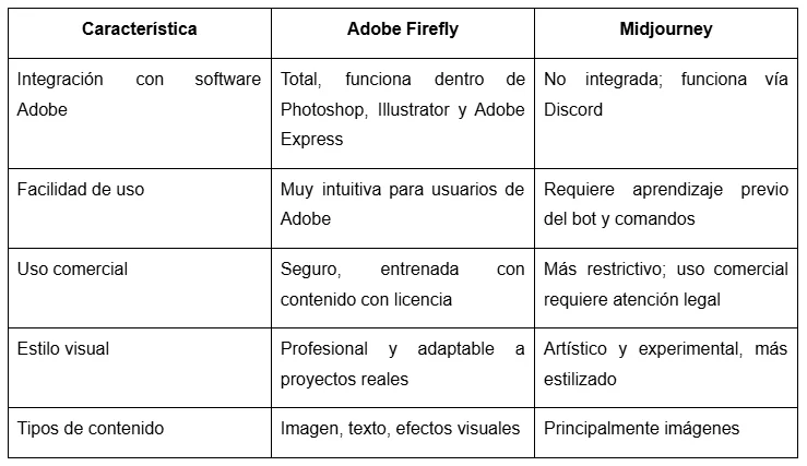 Entendemos que con tantas herramientas de inteligencia artificial generativa disponibles, es difícil decidir cuál se adapta mejor a tus proyectos. A continuación, analizamos cómo se compara Adobe Firefly con opciones muy populares como Midjourney, DALL-E y Stable Diffusion, destacando diferencias clave en funciones, facilidad de uso y compatibilidad profesional. ¿Listo? Vámonos: