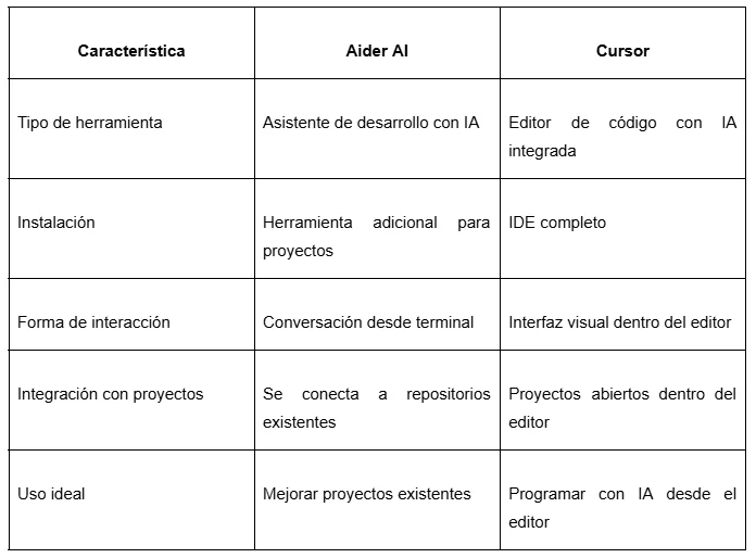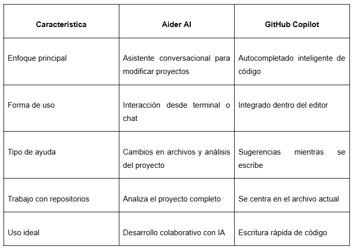 Aunque Aider comparte el mismo objetivo que otros asistentes, su forma de integrarse en proyectos y su manera de interactuar con el código presentan diferencias interesantes. Para entender mejor su lugar dentro de este ecosistema, vamos a compararlo con algunas de las soluciones más conocidas.