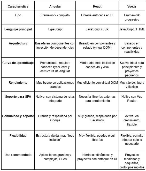 Basado en una arquitectura de componentes, cada unidad combina lógica, plantilla y estilos. Gracias a ello es posible crear partes de la aplicación reutilizables en distintos lugares sin duplicar código, lo que hace el desarrollo más eficiente y ordenado. Además, se mejora la mantenibilidad y la escalabilidad en proyectos de gran tamaño.