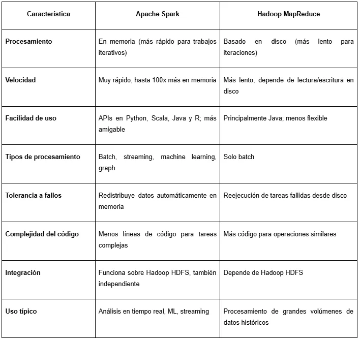 Spark se adapta a distintos formatos y fuentes: HDFS, bases SQL y NoSQL, archivos JSON o CSV, para combinar información de diferentes sistemas para generar reportes unificados, análisis de tendencias o dashboards interactivos, todo desde un único entorno, ahorrando tiempo y esfuerzo en la integración de datos.