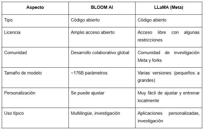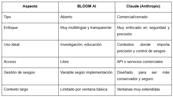 Por si no lo tienes claro, BLOOM AI se ha ganado su lugar por ser abierto y multilingüe, pero en el mercado también existen opciones como GPT, LLaMA o Claude, cada una con fortalezas distintas. Antes de decidir cuál usar, es útil ver cómo se comparan en aspectos como accesibilidad, rendimiento, personalización y enfoque de seguridad. ¡Veámoslo!
