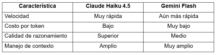 Cuando lo que más importa es velocidad y bajo precio, Gemini Flash suele venir con ventajas: es incluso más barato y rápido que Haiku 4.5 en benchmarks básicos, lo que lo hace muy competitivo para generación simple y contextos extremadamente largos. Sin embargo, Haiku 4.5 tiende a ofrecer mejor razonamiento en tareas complejas y calidad superior en outputs relacionados con lógica o código, algo que no siempre se logra con modelos ultra‑ligeros.