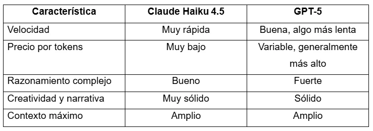 Claude Haiku 4.5 destaca por ser más rápido y económico, sobre todo en tareas donde la latencia y el coste por token importan; ideal para asistentes conversacionales y automatizaciones que reciben muchas solicitudes. GPT‑5, por su parte, suele ofrecer razonamiento estructurado más profundo y capacidades avanzadas de comprensión general, lo que lo hace más fuerte en problemas complejos o análisis extensos.