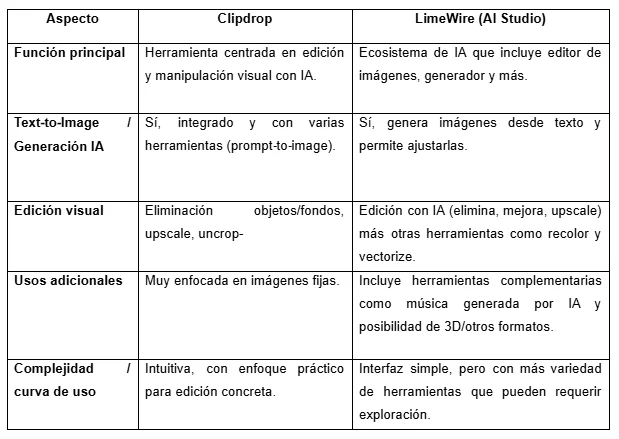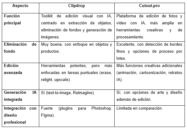 En este punto te dejaremos unas comparativas claras y útiles entre Clipdrop y tres rivales actuales en el terreno de IA visual: Cutout.pro, LimeWire (AI Studio) y Canva.