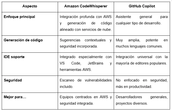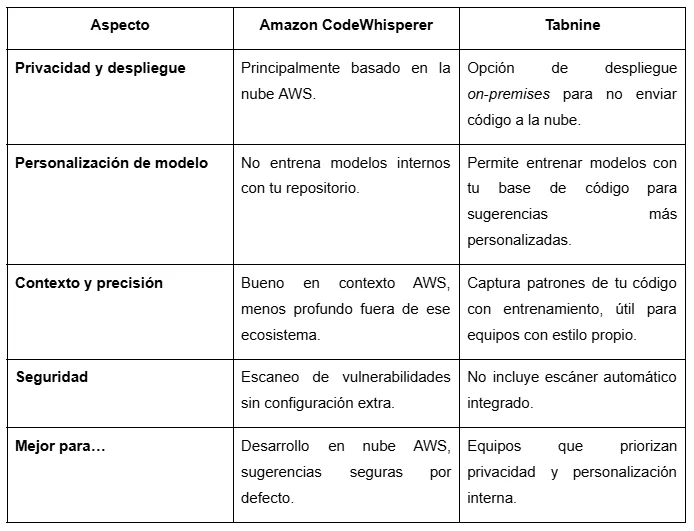La principal diferencia está en el enfoque: CodeWhisperer se integra profundamente con AWS y ofrece escaneo de seguridad incorporado, mientras que Tabnine permite entrenar modelos personalizados con tu propio código y ofrece opciones on‑premises para privacidad de proyectos. Cada uno tiene sus ventajas según el tipo de proyecto y equipo.