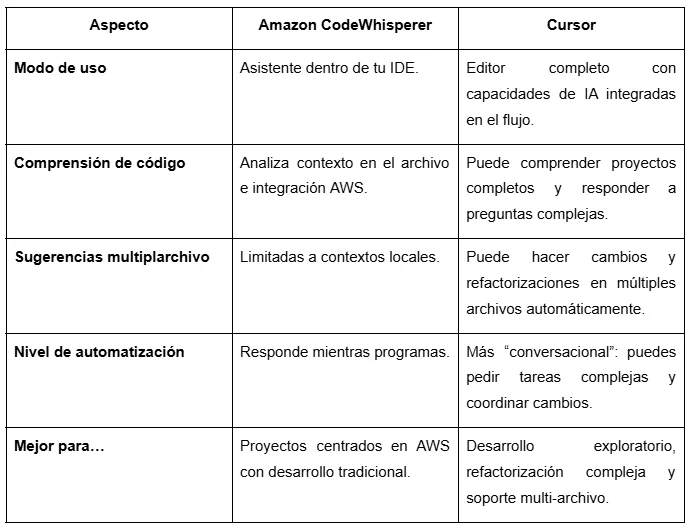 No todas las herramientas de asistencia de código son iguales, y elegir la correcta puede marcar la diferencia en tu productividad y seguridad. Por ello, aquí veremos cómo se posiciona CodeWhisperer frente a GitHub Copilot, Tabnine y Cursor.