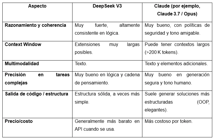 Aquí te dejamos una comparación clara entre DeepSeek V3 y otros modelos de lenguaje líderes para que veas en qué se parecen, en qué se diferencian y cuál puede ser más adecuado según lo que necesites hacer.