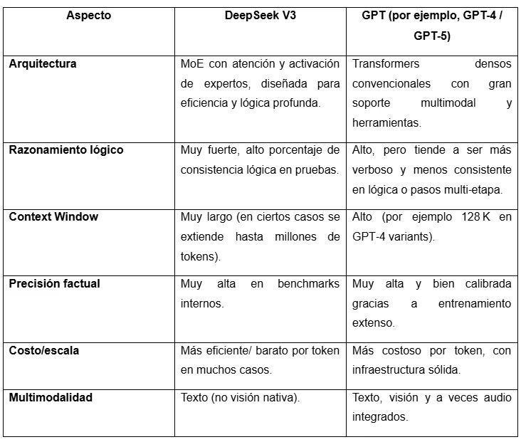 DeepSeek V3 se distingue por su arquitectura Mixture‑of‑Experts, que activa solo los “expertos” necesarios para cada tarea, ofreciendo un equilibrio entre potencia, eficiencia y costo. Destaca en razonamiento lógico, manejo de textos largos y tareas complejas de programación, mientras mantiene un consumo más bajo de recursos frente a modelos densos similares.