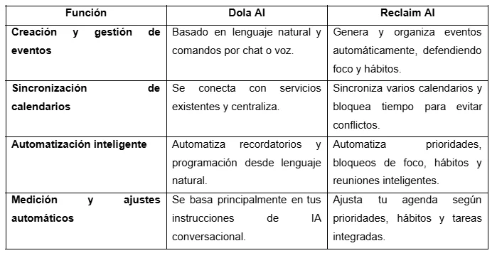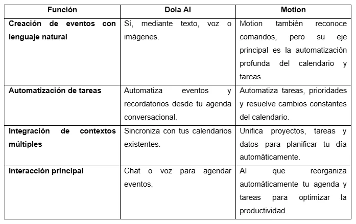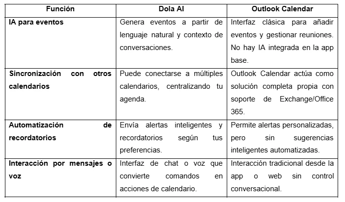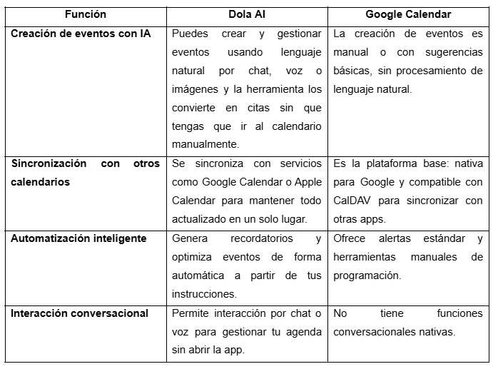 Cuando comparas aplicaciones de calendario inteligentes hoy en día, verás que algunas funcionan como herramientas clásicas de organización y otras usan inteligencia artificial para interactuar contigo o para automatizar tareas complejas. Debido a sus diferencias, es preciso comparar las más relevantes para nosotros, incluida Dola AI: