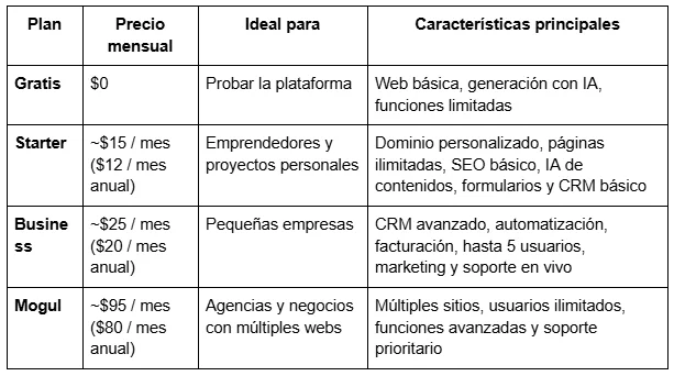 Esta plataforma, como la mayoría, ofrece distintos planes de suscripción pensados para adaptarse a diferentes perfiles, incluida una opción gratuita. Un punto que nos gustaría destacar en este caso es que todos los planes incluyen hosting y certificado SSL, por lo que no es necesario contratar servicios externos para publicar una web de forma segura. Te dejamos un resumen claro y comparativo de los planes disponibles.