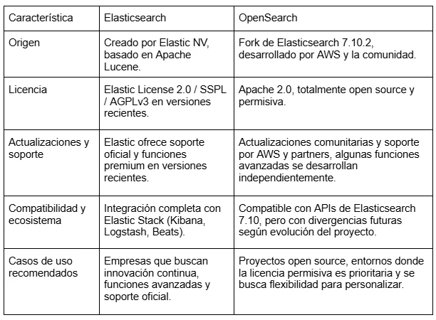 El ecosistema de búsqueda y análisis de datos ha evolucionado, y hoy existen alternativas que se adaptan a distintas necesidades. Una de las comparaciones más frecuentes es entre Elasticsearch y OpenSearch, este último un fork de Elasticsearch, es decir, una versión derivada que se desarrolla de manera independiente a partir del código original. A continuación, te presentamos un cuadro comparativo para entender mejor sus diferencias: