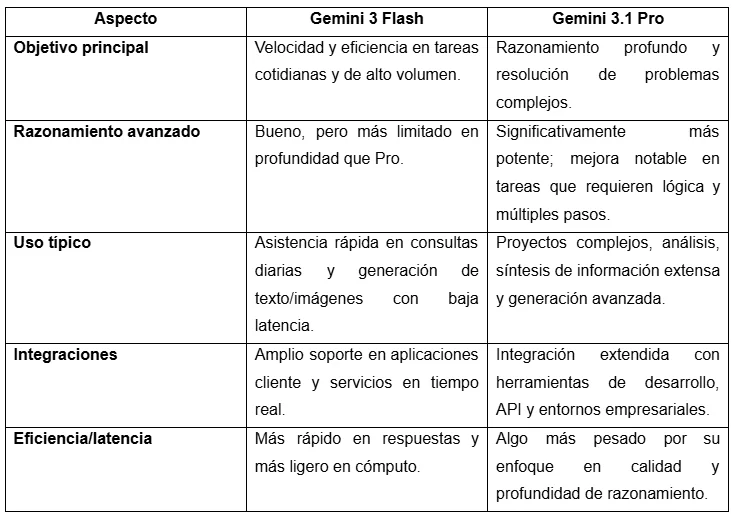 La versión “normal” de Gemini suele referirse a modelos más ligeros pensados para respuestas rápidas y uso general (como Gemini Flash en la app), mientras que Gemini Pro (y en particular Gemini 3.1 Pro) está diseñado para tareas más exigentes: razonamiento profundo, análisis multimodal (texto, imágenes, audio, video), contexto muy largo y resolución de problemas complejos. Pro es más potente, más capaz y orientado a trabajo profesional o técnico, no solo a consultas simples.