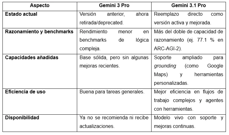 En 2025, con Gemini 3, se consolidó una generación centrada en aplicaciones más profundas y complejas. Finalmente, en 2026, Google lanzó Gemini 3.1 Pro, una versión que enfatiza el razonamiento avanzado, la resolución de problemas complejos y el manejo de contextos extensos, posicionándose como uno de los modelos de IA más potentes disponibles.