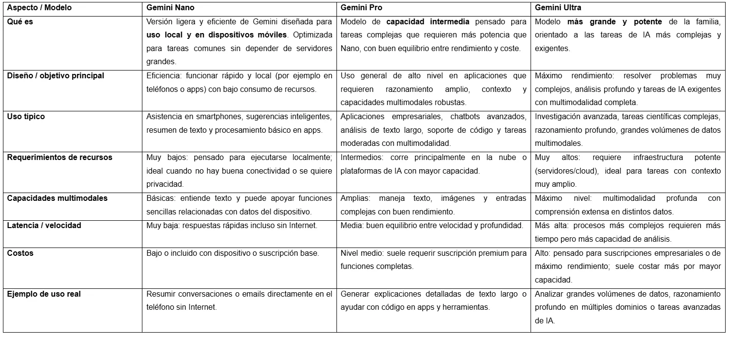 No exactamente. Gemini Nano es una versión ligera y optimizada de la familia Google Gemini, diseñada para funcionar de manera rápida y eficiente en dispositivos locales. Google Gemini, en cambio, abarca toda la línea de modelos, incluyendo Pro y Ultra, que son más potentes y requieren infraestructura en la nube.