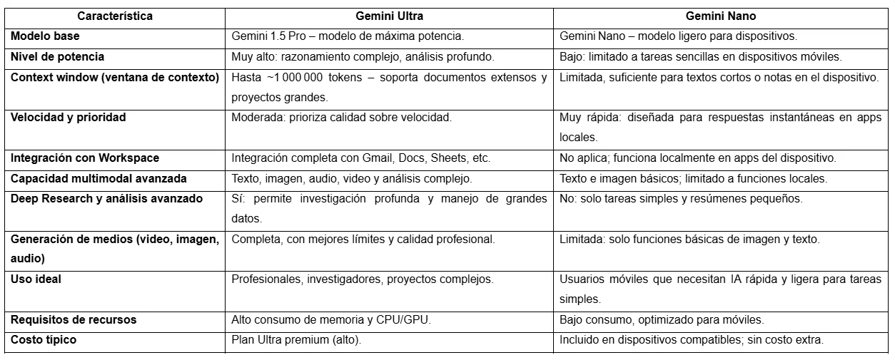Cuando hablamos de Google Gemini, no todos los modelos son iguales: desde la versión ligera Nano, pensada para dispositivos móviles, hasta la potente Ultra, diseñada para tareas complejas y análisis avanzados. Cada variante tiene su propio enfoque, potencia y capacidades, y elegir la correcta depende de lo que necesites: rapidez, contexto extenso, integración con herramientas o generación de medios.