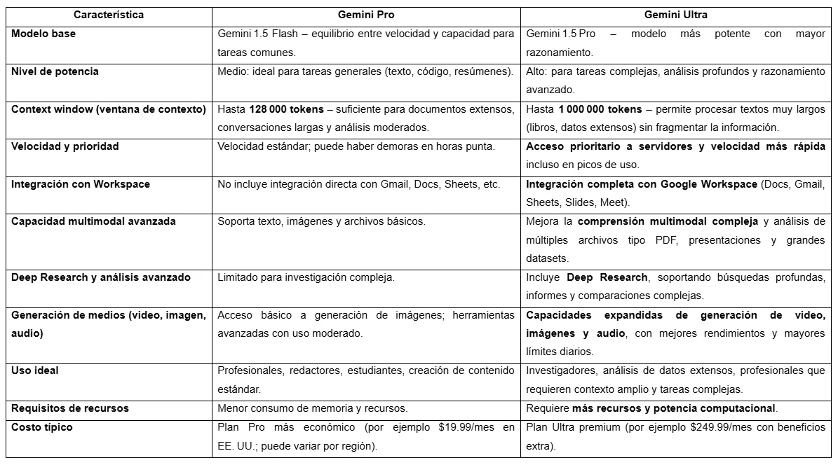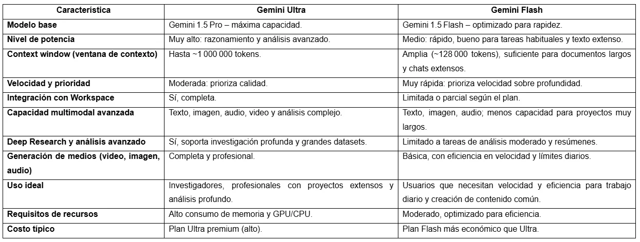 Gemini Ultra es la versión más potente de la familia de modelos de IA de Google, diseñada para quienes necesitan ir más allá de lo básico. No se trata solo de generar texto o responder preguntas: ultra procesa enormes cantidades de información, comprende contextos extensos y combina capacidades multimodales (texto, imágenes, audio e incluso video) con un razonamiento profundo.