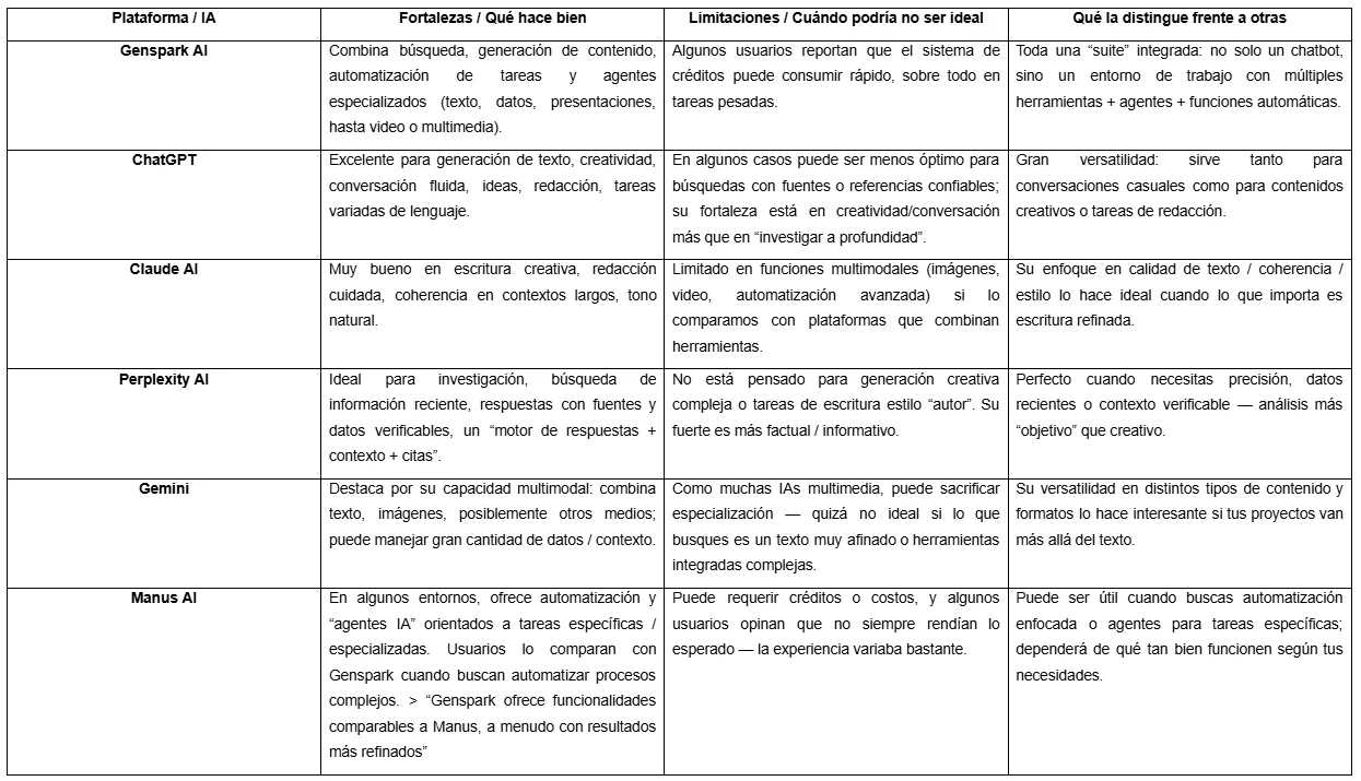 Depende del uso que busques. Genspark AI destaca en automatización de flujos de trabajo complejos y creación de contenido multimedia (texto, imagen, video, presentaciones), mientras que ChatGPT es más confiable para conversación fluida y generación de texto creativo. La elección depende de tus necesidades específicas.