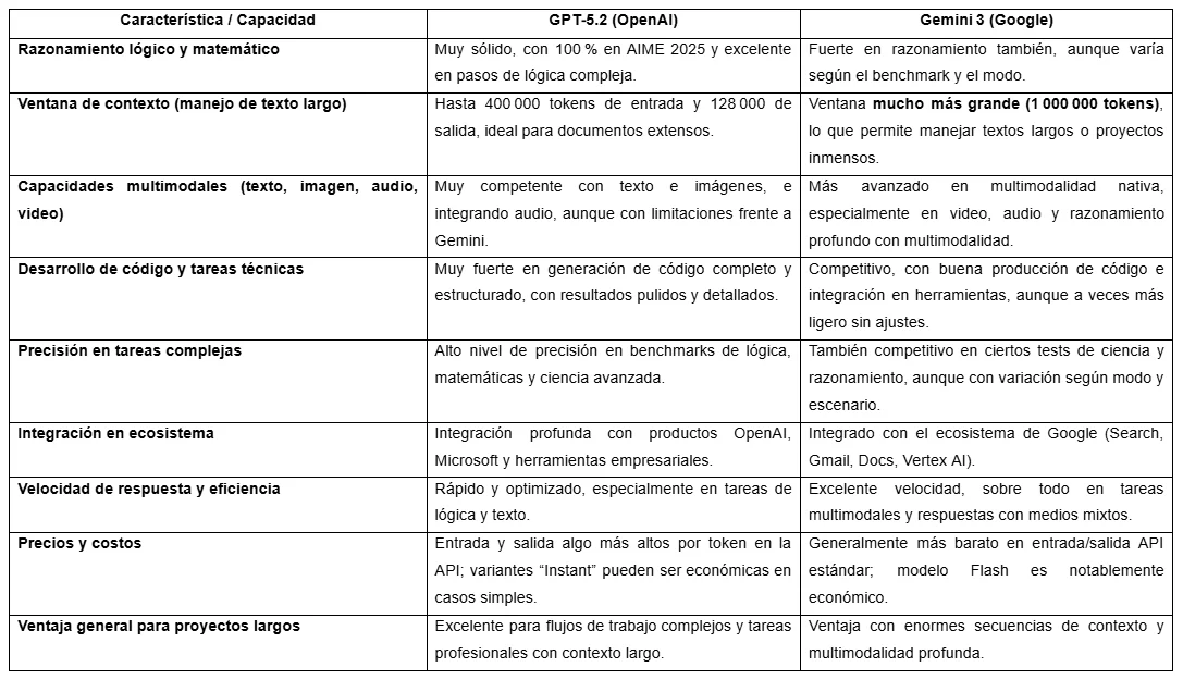 No hay un “mejor absoluto”: GPT‑5.2 suele destacarse en razonamiento lógico, generación de código y tareas textuales complejas, mientras que Gemini 3 tiene claras ventajas en multimodalidad (video, audio, grandes volúmenes de datos) y una ventana de contexto más amplia. La elección depende del caso de uso: para análisis profundo y programación GPT‑5.2 suele ser preferido; para flujos con contextos gigantes o multimedia, Gemini 3 puede sobresalir.