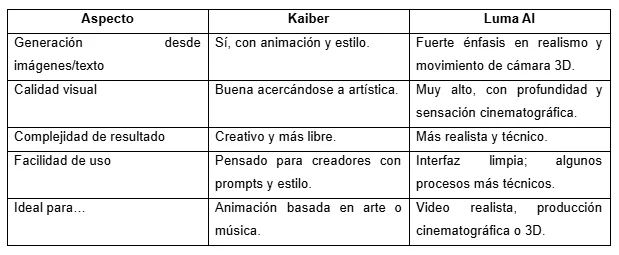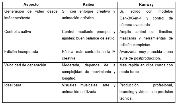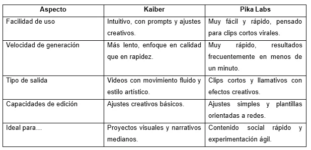 Comparar Kaiber con otras herramientas de video con IA es una manera de entender sus fortalezas y diferencias. Aquí te mostramos rápidamente en qué destaca cada opción y para qué tipo de proyectos funciona mejor.