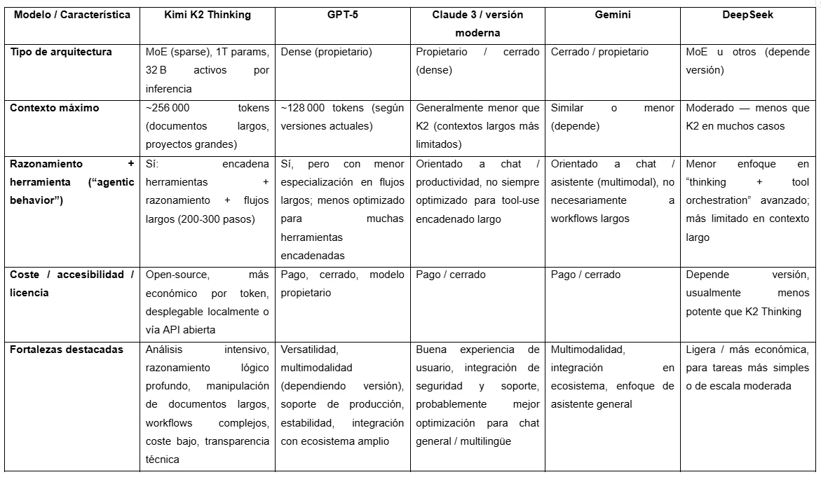 Kimi K2 Thinking destaca frente al resto porque usa una arquitectura Mixture‑of‑Experts (MoE) de enorme escala: ~ 1 billón de parámetros totales, con ~32 mil millones activos por inferencia. También, soporta una ventana de contexto muy grande: hasta 256.000 tokens, lo que le permite procesar documentos enormes, múltiples archivos o conversaciones largas sin perder coherencia.