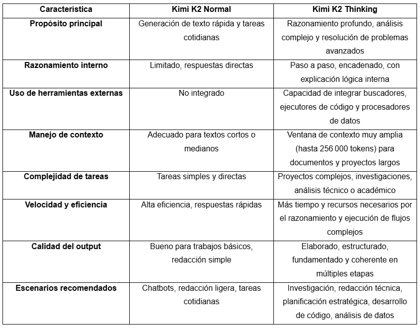 Kimi K2 Thinking no es simplemente una herramienta; es un compañero que organiza, analiza y transforma información compleja en decisiones claras. Sus capacidades de razonamiento paso a paso, manejo de contextos extensos y ejecución de flujos encadenados lo colocan en un nivel distinto frente a modelos tradicionales.