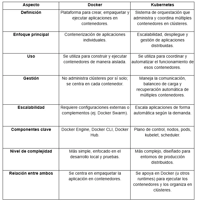 Veamos las principales diferencias entre Docker y Kubernetes: