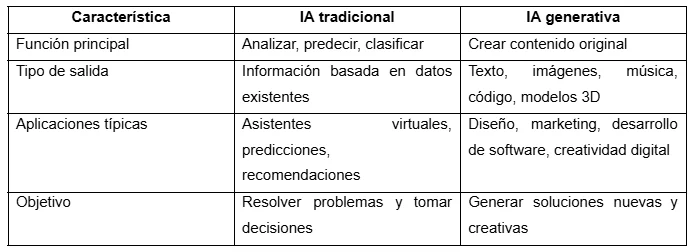 Por su parte, la IA generativa, es una rama específica de la IA que se centra en crear contenido original a partir de patrones aprendidos, ya sea texto, imágenes, música, código o modelos 3D. Mientras la IA tradicional se limita a analizar y responder, la IA generativa inventa y produce información nueva, aportando creatividad y soluciones innovadoras aplicables en diseño, marketing, desarrollo de software y automatización de contenidos.