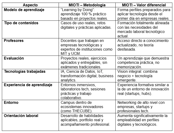 Con respecto a la misión, la idea es reducir la brecha del talento digital mientras forman profesionales en las competencias tecnológicas más demandadas por las empresas. Para lograrlo, MIOTI apuesta por una metodología "Learning by Doing" (aprender haciendo): sus cursos y másteres están diseñados para que los alumnos trabajen en proyectos reales, no solo teoricen.