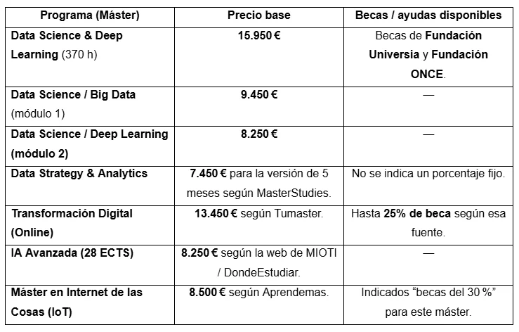 Los másteres y programas de MIOTI tienen un precio elevado en comparación con otras escuelas, por lo que conviene valorar si cuentas con presupuesto, becas disponibles o financiación. Es una inversión importante que debes analizar en función de tus objetivos profesionales.
