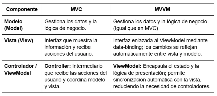 Ambos patrones comparten la idea de dividir la aplicación en capas, pero difieren en la forma en que se comunican la vista y la lógica.