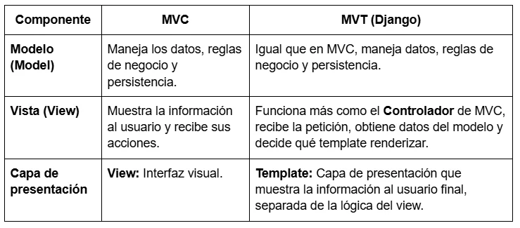 El patrón MVT, utilizado por Django, es una adaptación del MVC que reinterpreta los roles para ajustarse al entorno del framework.