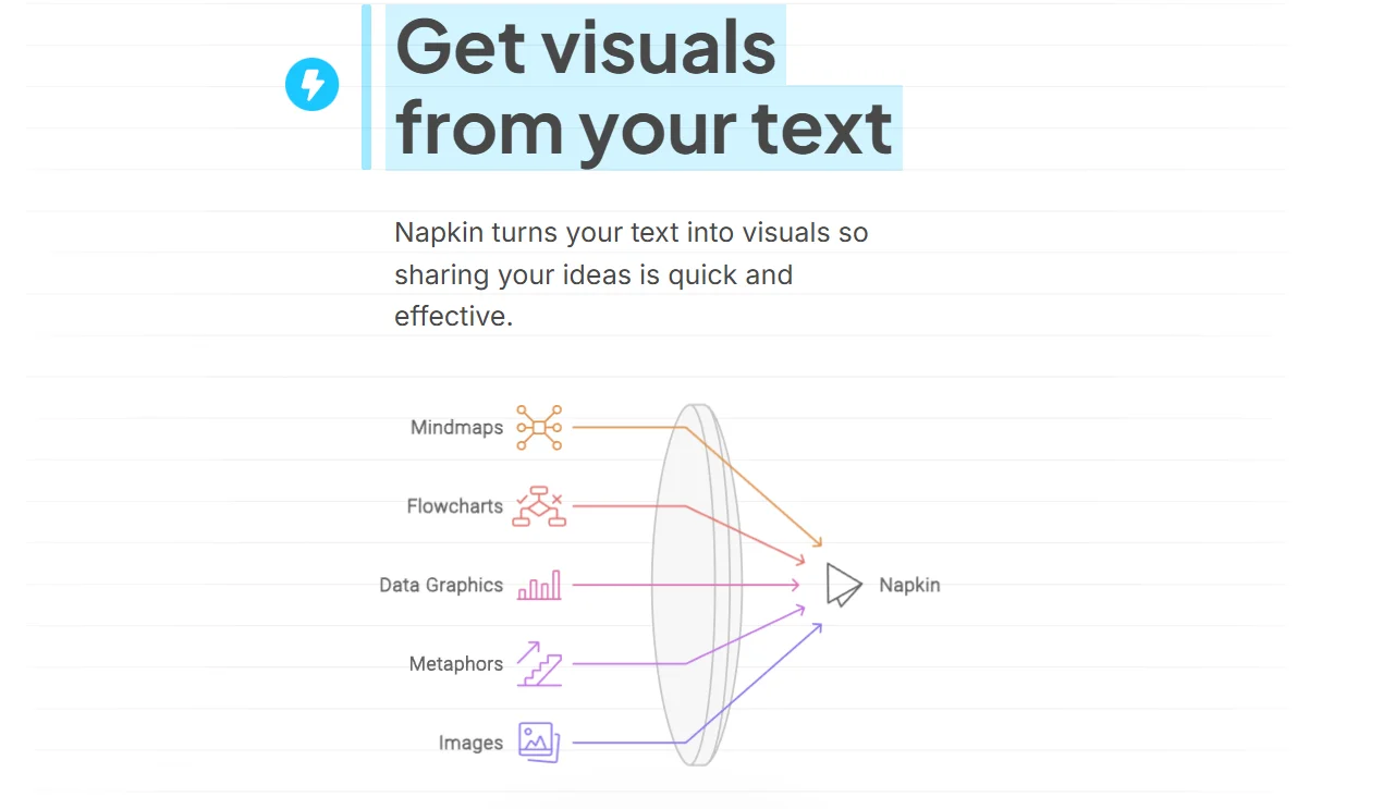 Napkin AI interpreta descripciones escritas y las convierte en diagramas coherentes: flujos de trabajo, mapas conceptuales, matrices, representaciones causa-efecto o comparativas. La herramienta analiza la estructura semántica del contenido para seleccionar el tipo de visual más adecuado y organizarlo de forma clara.