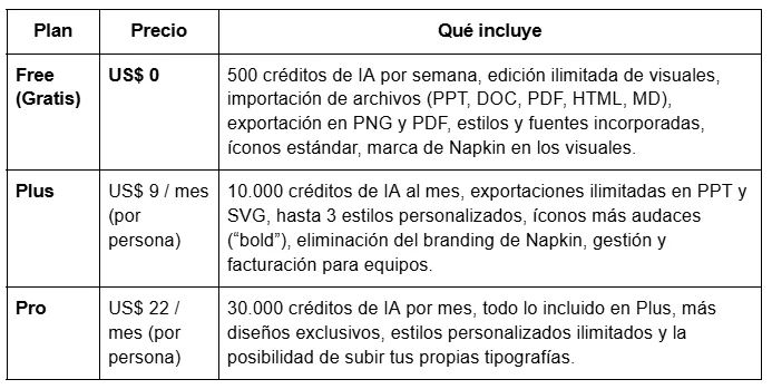 Sí, Napkin es gratis, pero también tiene planes pagos. Estos son: