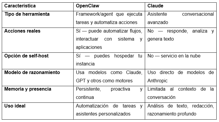 Básicamente, Claude y OpenClaw no son exactamente rivales directos: Claude es uno de los “cerebros” que puedes usar dentro de OpenClaw si lo configuras así. OpenClaw pone ese cerebro a trabajar “en el mundo real”, mientras que Claude se centra en entender y generar respuestas complejas. Los detalles son: