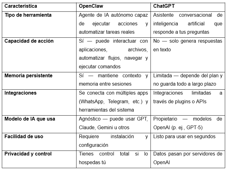 Sí, aunque ambos usan inteligencia artificial para procesar lenguaje natural, la diferencia clave es la autonomía. ChatGPT se limita a generar respuestas en texto, mientras que OpenClaw puede ejecutar acciones reales, automatizar tareas y conectarse con aplicaciones y sistemas para realizar trabajos de manera autónoma.