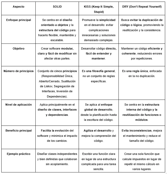 Anteriormente lo comentamos, pero recalcamos que cada principio representa una buena práctica que mejora la estructura y la estabilidad de los proyectos de software. A detalle, significan: