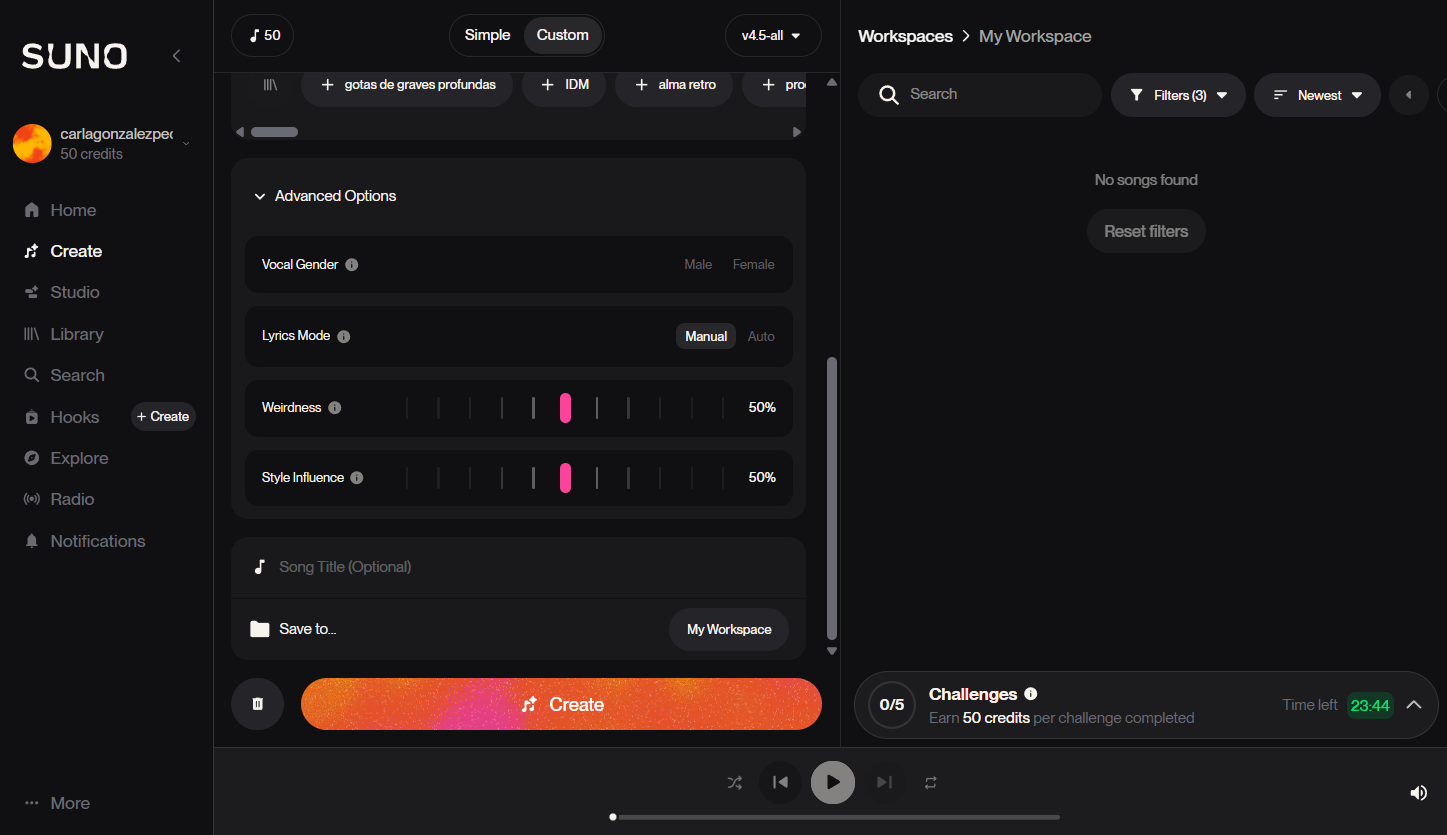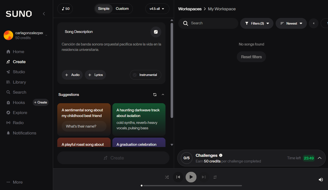 Haz clic en el botón "Crear". Suno AI procesará tu solicitud y generará una canción basada en tus indicaciones. Este proceso puede tardar unos minutos.