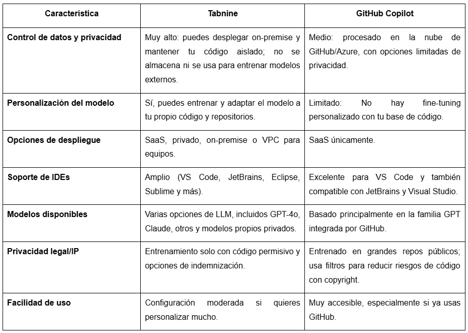 Depende de tus necesidades. Copilot destaca por su integración con GitHub y fluidez de uso, mientras que Tabnine sobresale en privacidad, personalización y control sobre tus datos, especialmente útil en entornos empresariales.
