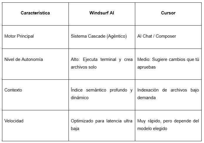No hay un "mejor" absoluto, depende de tus prioridades. Cursor es ideal si buscas una experiencia casi idéntica a VS Code pero con esteroides de IA para depuración profunda. Por otro lado, la herramienta de Codeium destaca en la comprensión del flujo completo (contexto) y la ejecución autónoma de tareas pesadas. Si prefieres que la IA "tome el teclado" para configurar infraestructuras o realizar cambios masivos en el repositorio, la capacidad agéntica de Windsurf suele percibirse como más avanzada.